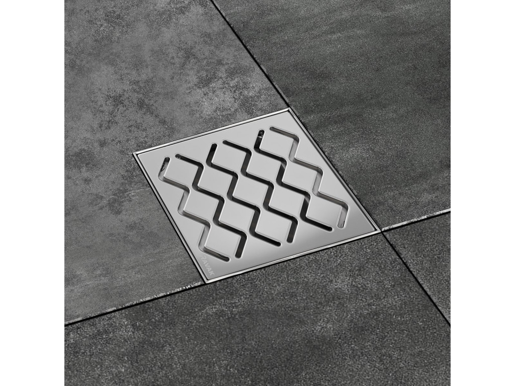 Az SN501 hullámmintás padlóösszefolyó különösen alkalmas a zuhanysarkokhoz, fürdőszobákba valamint ipari területeken. Az építési magassága 104 mm. Rozsdamentes acél perem. Az alsó szigetelő gallér külön rendelhető SN501-hez 300x300 mm.