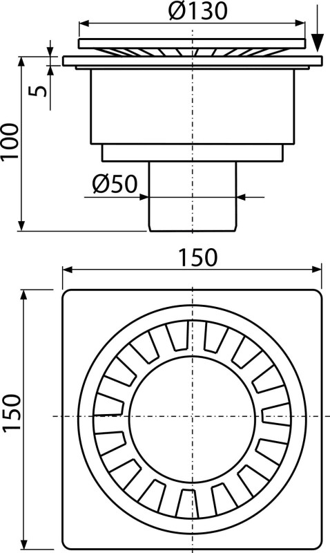 Alcaplast APV16 padló összefolyó 150x150/50 mm fehér műanyag, egyenes kiv