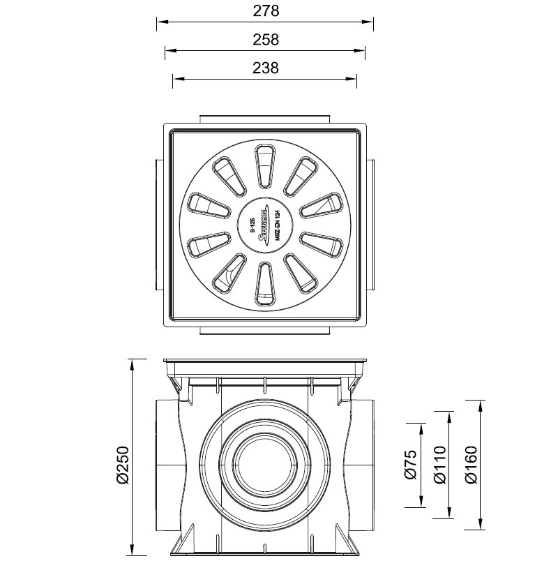 Esővíz folyókához udvari gyűjtő szürke 250x250x250mm műa. test önt. rács B125